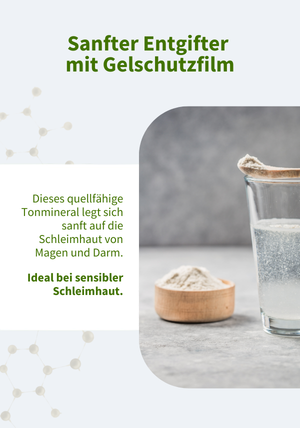 Ähnlich wie Zeolith ist auch Bentonit ein vulkanisches Mineral, das durch Verwitterung von Vulkanasche entstanden ist. Die schichtartige Struktur und vorteilhafte Mikronisierung verleihen dem Mineral seine besonderen Eigenschaften. Insbesondere ist Bentonit durch selektiven Ionenaustausch und Adsorption dafür geeignet, Schadstoffe wie Blei, Quecksilber, Cadmium und Aluminium zu binden und sanft über den Darm aus dem Körper zu leiten. Dabei bildet Bentonit einen schützenden Gelfilm im Magen-Darm-Trakt des Menschen, wodurch das Naturmineral hervorragend für Menschen geeignet, die einen empfindlichen Magen oder Darm haben.