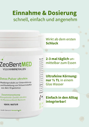 Simply stir the powder into a glass of water (250 ml) and drink with a meal. Use 1 teaspoon of ZeoBent detox powder 2-3 times a day. Further details can be found in the ZeoBentMED instructions for use.