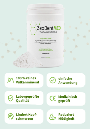 En consecuencia, ZeoBentMED puede aliviar el organismo de forma natural mediante la unión de sustancias nocivas. Además, el contenido de montmorillonita-bentonita protege la mucosa del tracto digestivo formando una película de gel protectora. ZeoBentMED ayuda a reducir síntomas como dolores de cabeza y fatiga que pueden aparecer debido a una mayor exposición a metales pesados.