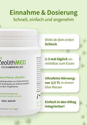 El indigerible ZeolithMED puede unirse selectivamente a ciertas sustancias nocivas en el tracto gastrointestinal como una esponja y eliminarlas del cuerpo de forma natural. De este modo, las sustancias nocivas ligadas a ZeolithMED en el tracto gastrointestinal se eliminan de forma natural a través de los intestinos sin sobrecargar el metabolismo. Esto significa que entran menos toxinas en el organismo. Al ligar las sustancias nocivas, ZeolithMED puede aliviar el organismo y mitigar síntomas como dolores de cabeza y cansancio causados por una mayor carga de metales pesados.