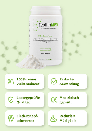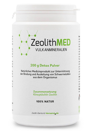 ZeolithMED è un prodotto naturale, testato in modo indipendente e certificato CE, a base di zeolite clinoptilolite, indigeribile e insolubile in acqua, con un'elevata capacità di adsorbimento selettivo e funzioni di setaccio molecolare nei confronti di vari inquinanti e quindi adatto alla disintossicazione.