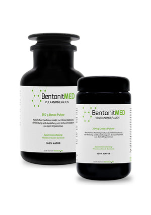 BentonitMED ist ein natürliches Produkt mit CE-Zertifizierung in Apothekenqualität aus dem Tonmineral Montmorillonit-Bentonit, das an seiner Oberfläche und den Schichtzwischenräumen verschiedene Schadstoffe binden kann und deshalb zur Detoxikation (Entgiftung) geeignet ist. Es ist unverdaulich, wasserunlöslich sowie quellfähig und bildet bei oraler Verabreichung im Unterschied zum ZeolithMED einen dünnen Montmorillonit-Gelschutzfilm. BentonitMED eignet sich damit vor allem zur Entgiftung bei empfindsamer Schleimhaut des Verdauungskanals.