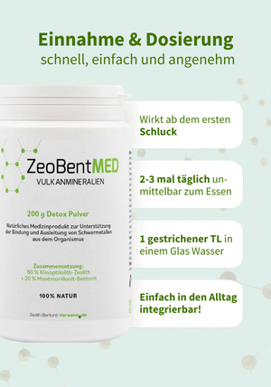 Das Pulver einfach in ein Glas Wasser (250 ml) einrühren und zu einer Mahlzeit trinken. 2-3 mal täglich wird 1 Teelöffel von ZeoBent Detox-Pulver verwendet. Weitere Details findest du in der Gebrauchsanweisung ZeoBentMED.