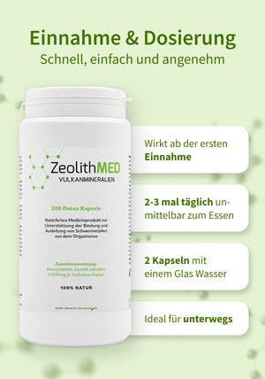 2-3x täglich 2 Kapseln ZeolithMED Detox-Kapseln mit einem Glas Wasser (250 ml) einnehmen. Weitere Details finden Sie in der Gebrauchsanweisung ZeolithMED.