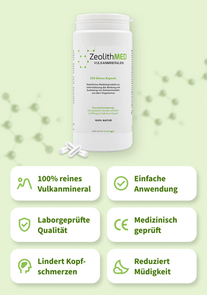 ZeolithMED ist ein natürliches unabhängig geprüftes Produkt mit CE-Zertifizierung aus Klinoptilolith-Zeolith, welches unverdaulich und wasserunlöslich ist, eine hohe selektive Adsorptionsfähigkeit sowie Molekularsiebfunktionen gegenüber verschiedenen Schadstoffen besitzt und deshalb zur Detoxifikation (Entgiftung) geeignet ist.