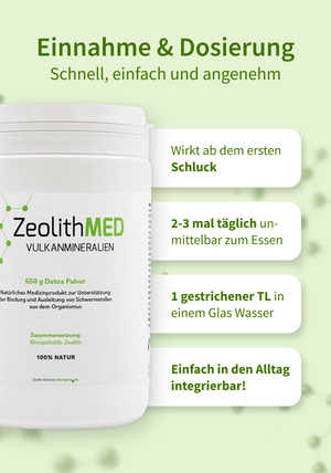 Das Pulver einfach in ein Glas Wasser (250 ml) einrühren und zu einer Mahlzeit trinken. 2-3 mal täglich wird 1 gestrichener Teelöffel von ZeolithMED Detox-Pulver verwendet. Weitere Details finden Sie in der Gebrauchsanweisung ZeolithMED.