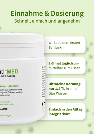 Das ultrafeine Pulver einfach in ein Glas Wasser (250 ml) einrühren und zu einer Mahlzeit trinken. 2-3 mal täglich wird ½ Teelöffel von ZeolithMED Detox-Pulver ultrafein verwendet. Weitere Details findest du in der Gebrauchsanweisung ZeolithMED.